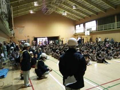 講堂に児童も地域の方々も集まって、本部を設置し、人員点呼、負傷者・疾病者の確認から始まって、DVD「津波からにげる」をみました。みんな真剣に見ていました。