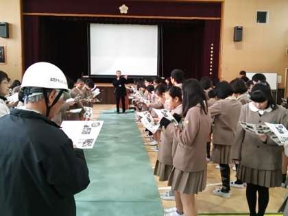 6年生は大阪市の危機管理室の方の指導のもと、地域の方と合同で講堂に避難所を設置し、間仕切を作る訓練を受けました。皆で協力して活動しました。