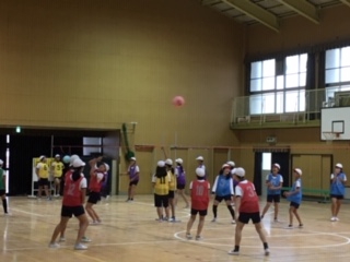 体育の時間に、ソフトバレーボールに取り組んでいます。簡易ネットをはり、試合を楽しんでいました。特別ルールもあるようです。