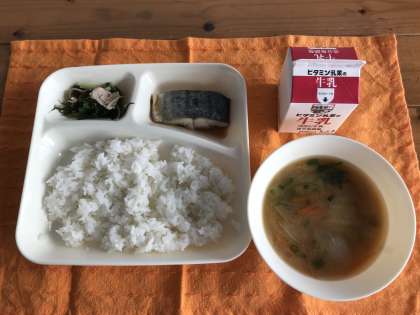 さごしのしょうゆだれかけ、みそ汁、みずなの煮びたし、ごはん、牛乳