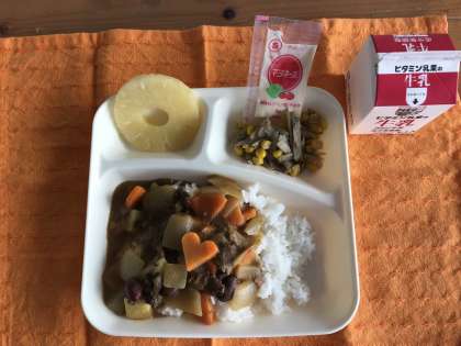 カレーライスには、調理員さんから「ラッキーにんじん」のサプライズプレゼントがありました。数は少ないので、全員には配れませんでした。また、次の機会を楽しみにしておいてください。(栄養教諭)