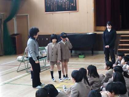 4年生が、区の社会福祉協議会の協力を受け、車いす・アイマスクの体験授業をしました。当日は、お話を聞き、実際に車いすとアイマスクを使っての体験をしました。