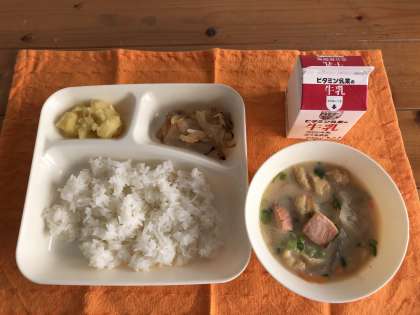鶏肉の甘辛焼き、かす汁、くりきんとん、ごはん、牛乳