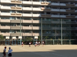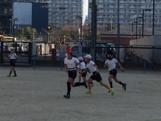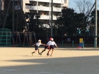 4年1組の体育授業の前半の様子です。チームに分かれて「しっぽとり」をしていました。