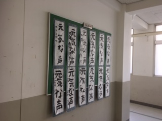 4年生の書道です。「元気な声」を廊下に展示しています。