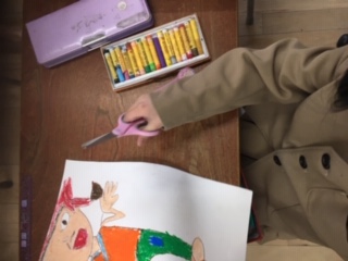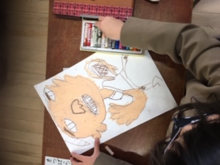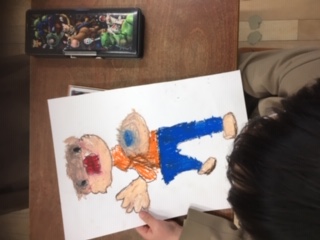 「花さかじいさん」の絵を画用紙いっぱいに描いています。
