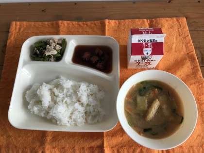 泉だこのやわらか煮、みそ汁、こまつなの煮びたし、ごはん、牛乳