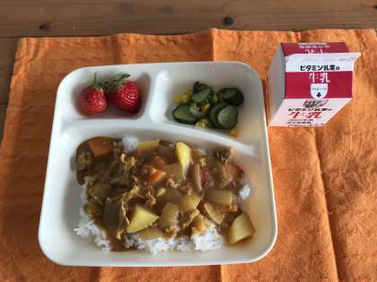 ポークカレーライス、きゅうりとコーンのサラダ、いちご、牛乳