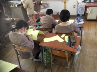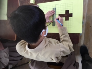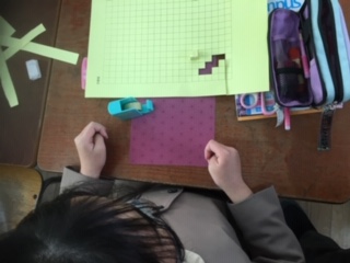 4年生の算数です。立方体や直方体の展開図について勉強しています。今日は、方眼紙を使って、展開図を書いたり、切ったりして、実際に箱の形になるか確かめていました。