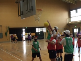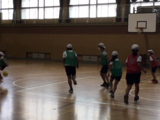 体育「バスケットボール」の様子です。2コートを使って試合をしています。