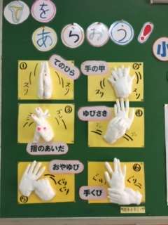 1階の掲示版に掲示されている「手をあらおう」です。健康委員会の作成です。