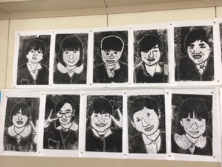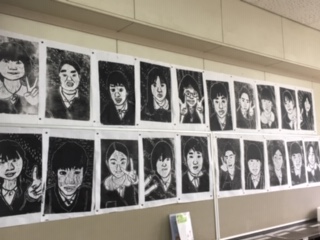 4年2組の自画像の版画が仕上がり、学級で掲示されていました。一人一人の表情が豊かにあらわされています。