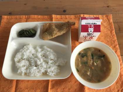 いわしのフライ、みそ汁、きゅうりのあかじそあえ、ごはん、牛乳