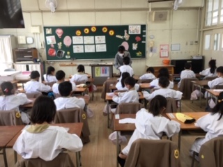 エプロンを着る練習をしていました。今日は初めての給食です。