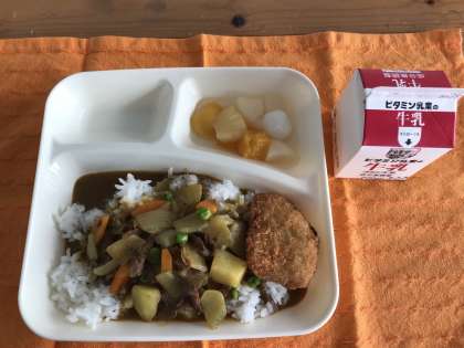 1年生にとっては、小学校で食べる初めての給食でした。カレーライスもフルーツ白玉も「おいしい。」と言いながら食べていました。カレールウは少し辛かったかもしれません。小学校でいろいろ食べものを経験してほしいですね。(栄養教諭)