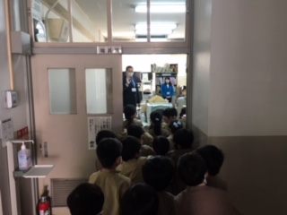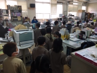1年生の児童が、学校の中を「たんけん」しました。職員室では、しっかりと挨拶ができていましたよ。