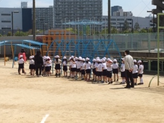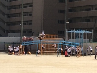 運動場にある「遊具の使いかた」などを担任の先生から教えてもらっていました。後半は、遊具で遊びました。