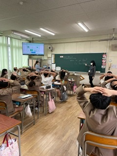 新しいC-NETの先生と外国語の授業を楽しんでいます。キーワードを言われたら(eraser)消しゴムをとるゲームをしています。