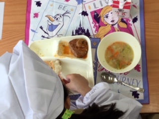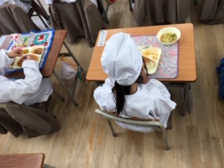 1年生の給食の様子です。今日は、子ども達に人気のハンバーグがでていました。コロナ感染予防のため、机を前に向け静かに食べています。