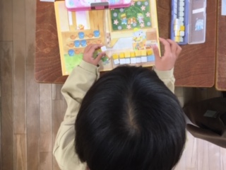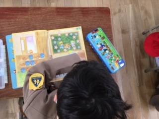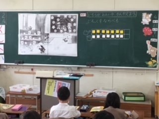 算数の時間です。ブロックを並べて「どちらが多いか」を考える学習をしていました。