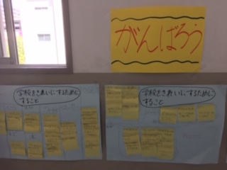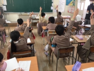 家庭学習の振り返りを行っていました。手の挙げ方が素晴らしいです。廊下には、自分たちで考えた「学校をきれいにするためにすること」が張られていました。