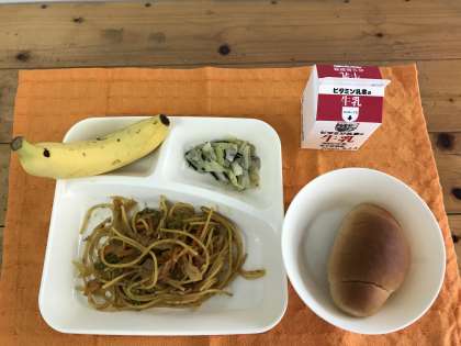 カレースパゲッティ、キャベツのひじきドレッシング、バナナ、