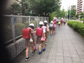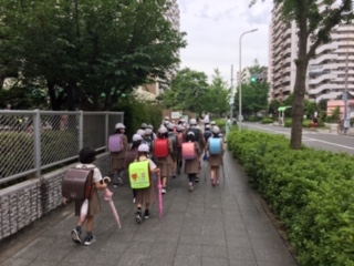 本日より、8時15分から25分までの登校となっています。集団登校が、しっかりできている班が多いです。