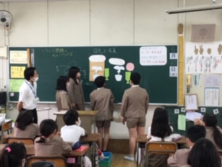理科の授業です。植物の発芽や成長に必要な条件を班で発表しているところです。