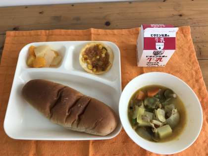 豚肉と野菜のカレースープ煮、変わりピザ、ミックスフルーツ(缶)、