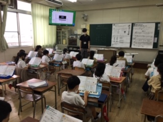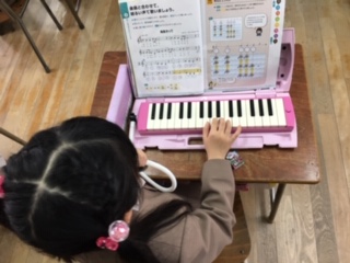 音楽です。指使いに気をつけながら、鍵盤ハーモニカの練習をしました。