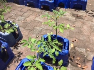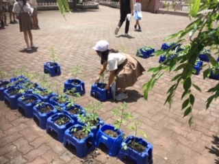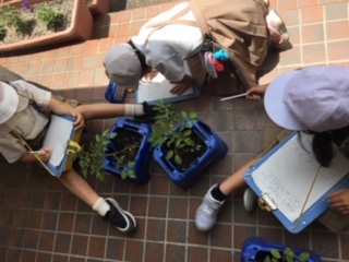 観察カードに、ミニトマトの成長を記録しています。黄色の花を咲かせている鉢植えもありました。