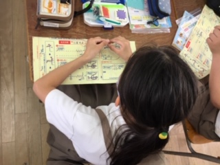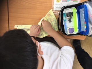 家庭科(裁縫)です。今日は、玉止め・玉結びの練習でした。説明を熱心に聞いた後、チャレンジしました。