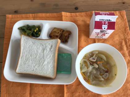 三度豆とコーンのサラダ、食パン(りんごジャム)、牛乳