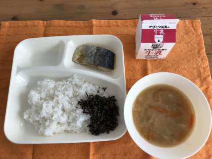 さごしの塩焼き、みそ汁、牛ひじきそぼろ、ごはん、牛乳