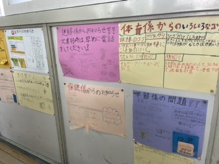 教室には、子ども達が自分たちで考えたポスターが貼ってありました。色んな工夫をしながら、学校を良くする取り組みがなされています。