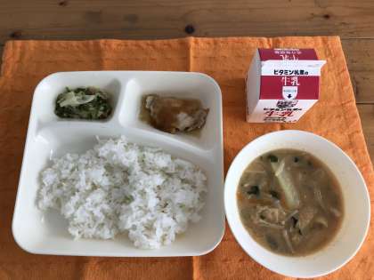 鶏肉のおろしじょうゆかけ、みそ汁、野菜いため、ごはん、牛乳