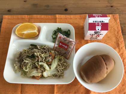 和風焼きそば、オクラの甘酢あえ、オレンジ、黒糖パン(小)、牛乳