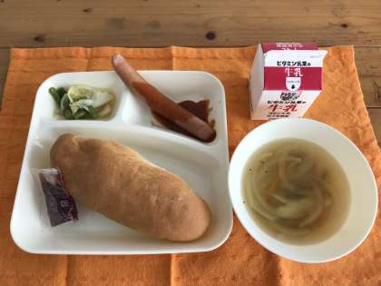 今日の給食では、ゆでたウインナーソーセージにケチャップ味のソースをかけています。皿の仕切りに収まらない程の長さでした。(栄養教諭)