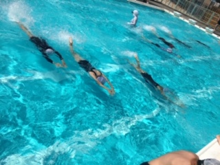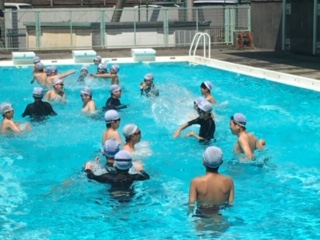 5時間目、6年2組と3組のプール水泳の様子です。6年生にとっては、1年ぶりの学校のプールです。とても気持ちよさそうでした。