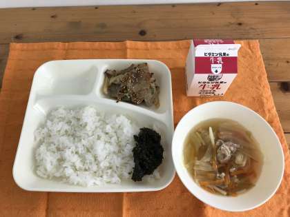 豚肉のごまみそ焼き、すまし汁、のりのつくだ煮、ごはん、牛乳
