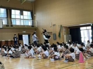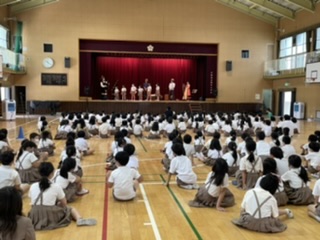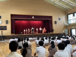 今日は、「ケルティックコレクション」さんに来ていただき、「バグパイプ」や「アイリッシュハープ」、「ホイッスル」と呼ばれる笛や「バウロン」と呼ばれる打楽器を使ってたくさんの曲を演奏してくれました。民族音楽の珍しい音色に子ども達も体を揺らしたり、手拍子をしたりして鑑賞しました。バグパイプの楽器体験では、6年生の男の子が大きな音を鳴らすことができ、大きな拍手を受けていました。