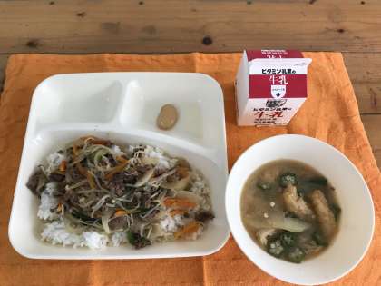 牛丼、とうがんのみそ汁、白花豆の煮もの、牛乳