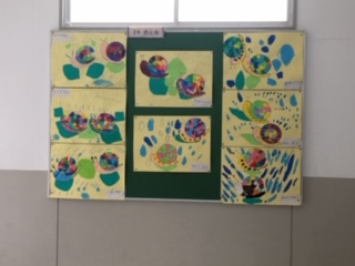 廊下掲示です。色鮮やかに「かたつむり」を描いていました。
