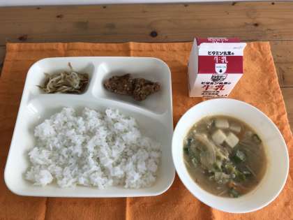 豚肉の香味あげ、みそ汁、もやしのおひたし、ごはん、牛乳