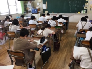 家庭科「1学期の振り返りテスト」を行っていました。ナップサックは、ほとんどの児童が完成しているようです。