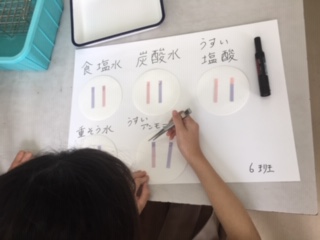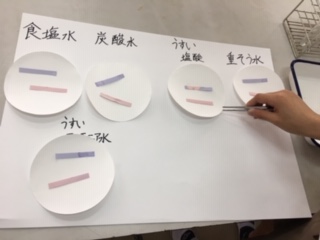 リトマス紙を使って、水溶液の仲間分けをしているところです。