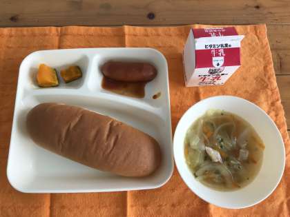 フランクフルトのケチャップソース、スープ、焼きかぼちゃ、黒糖パン、牛乳