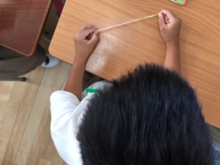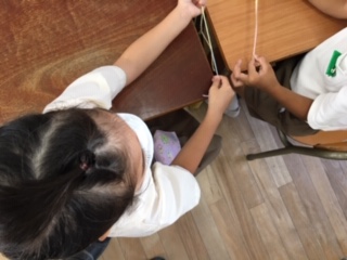 算数「どちらがながい」に取り組んでいます。実際に2本のひもの長さを比べているところです。