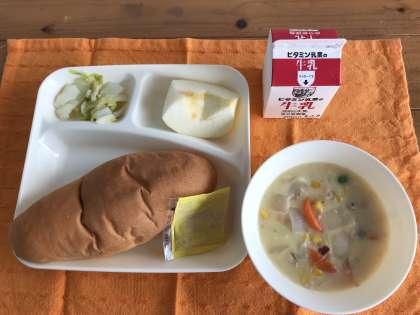 コーンクリームシチュー(米粉)、はくさいのピクルス、りんご、