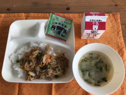 ピり辛丼、中華スープ、ソフト黒豆、牛乳